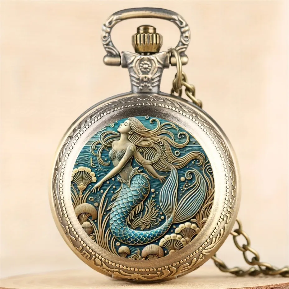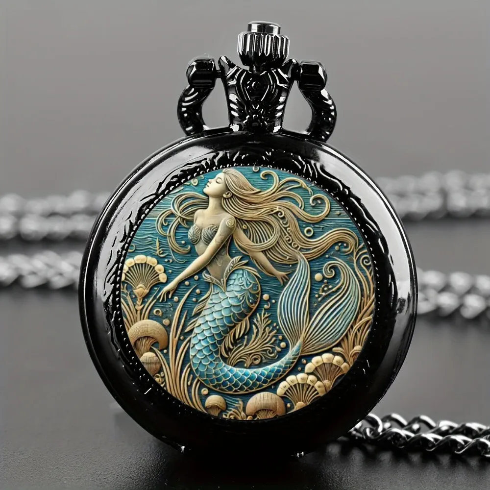 1Pcs Exquisite Mermaid Pattern Design Pocket Watch with Necklace Pendant -Quartz Movement, Elegant Jewelry Gift for Women Girls