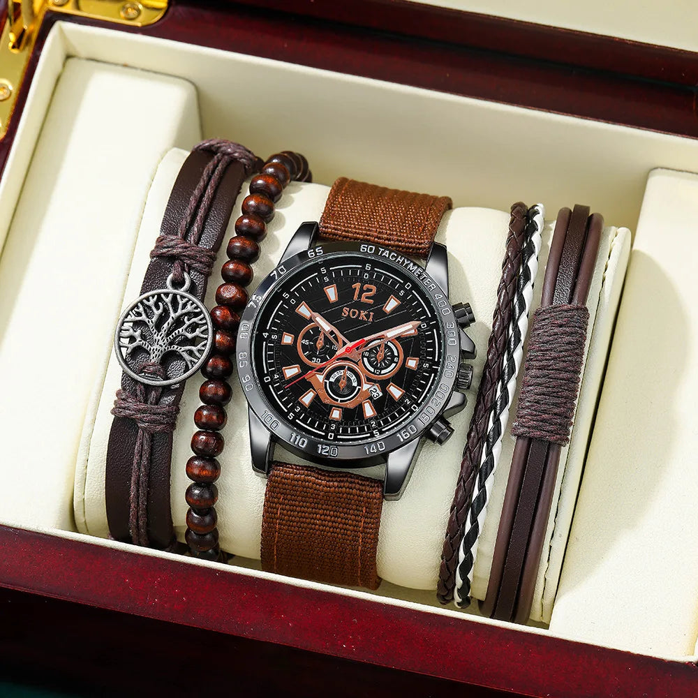 New Men Watches Bracelet Set Luxury Fashion Nylon Band Quartz Wristwatch Bracelets Gift Clock Male Relogio Masculino No Box