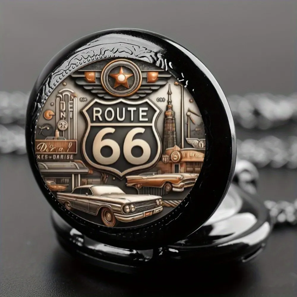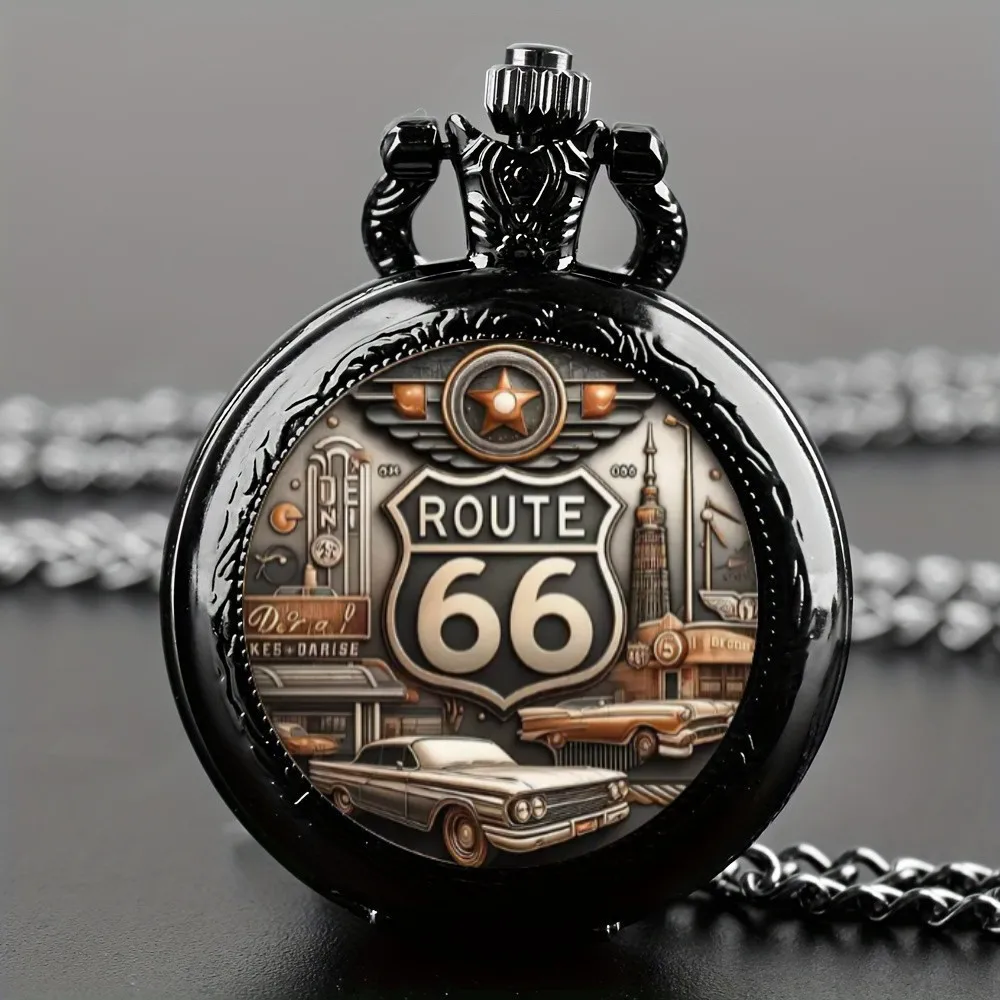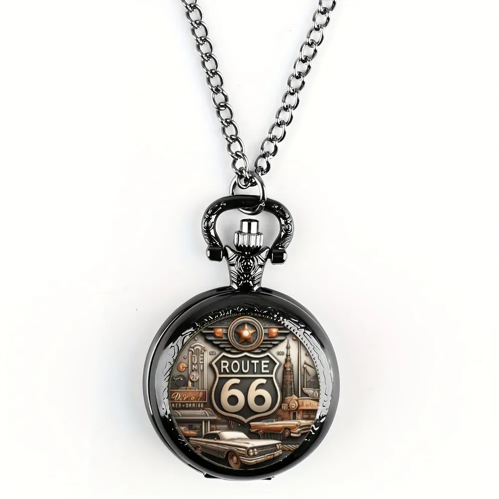 Vintage Route 66 Pattern Pocket Watch,Men's Fashion Quartz Necklace Pendant, World Time Display, Round Dial, Electronic Movement